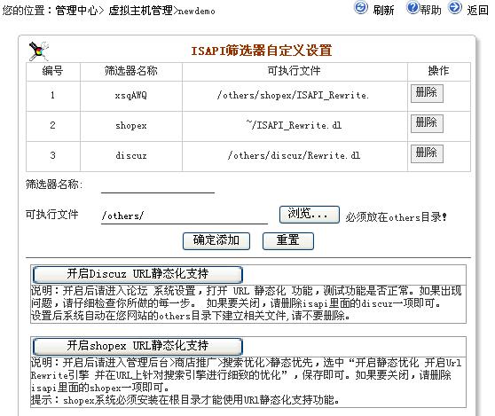 其他系统,用户可以自己将相关的dll文件上传至others目录,并点击添加 ISAPI筛选器 即可生效。 理论上可以支持任何系统的urlrewrite, 同时可以扩展支持其他isapi筛选功能。